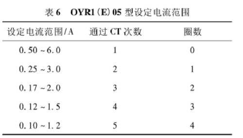 低壓電動機保護器的額定電流設(shè)置,除取決于輸出繼電器的觸點容量外,還取決于采集主回路電流信號的電流互感器(Current Transformer,CT)。一般額定電流值不大時,采用內(nèi)置 CT 輸出的信號進行處理。但是,當工作電流太小,未達到0. 5 A 時,可以通過增加電纜穿過 CT 上窗口的圈數(shù)來提高二次感應(yīng)電流,達到與保護線路的匹配,如表 6 所示。