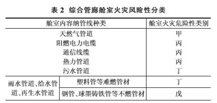 根據(jù) 《城市綜合管廊工程技術(shù)規(guī)范》(GB508382015),綜合管廊艙室火災(zāi)危險(xiǎn)性分類如表2所示:天然氣管道艙室的火災(zāi)危險(xiǎn)性類別為較高級;阻燃電力電纜、通信電纜、 熱力管道的火災(zāi)危險(xiǎn)性類別均為丙級;污水管道、塑料管等難燃管材的火災(zāi)危險(xiǎn)性類別均為丁級;鋼管、球墨鑄鐵管等不燃管材的火災(zāi)危險(xiǎn)性類別為戊級。