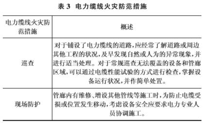 ⑥電力纜線在施工時(shí)采用明火引起的火災(zāi)。通過對綜合管廊電力纜線火災(zāi)危險(xiǎn)性的分析,需要對電力纜線做好維護(hù)與管理工作,防范電力電纜火災(zāi)的發(fā)生,防范措施如表3所示。