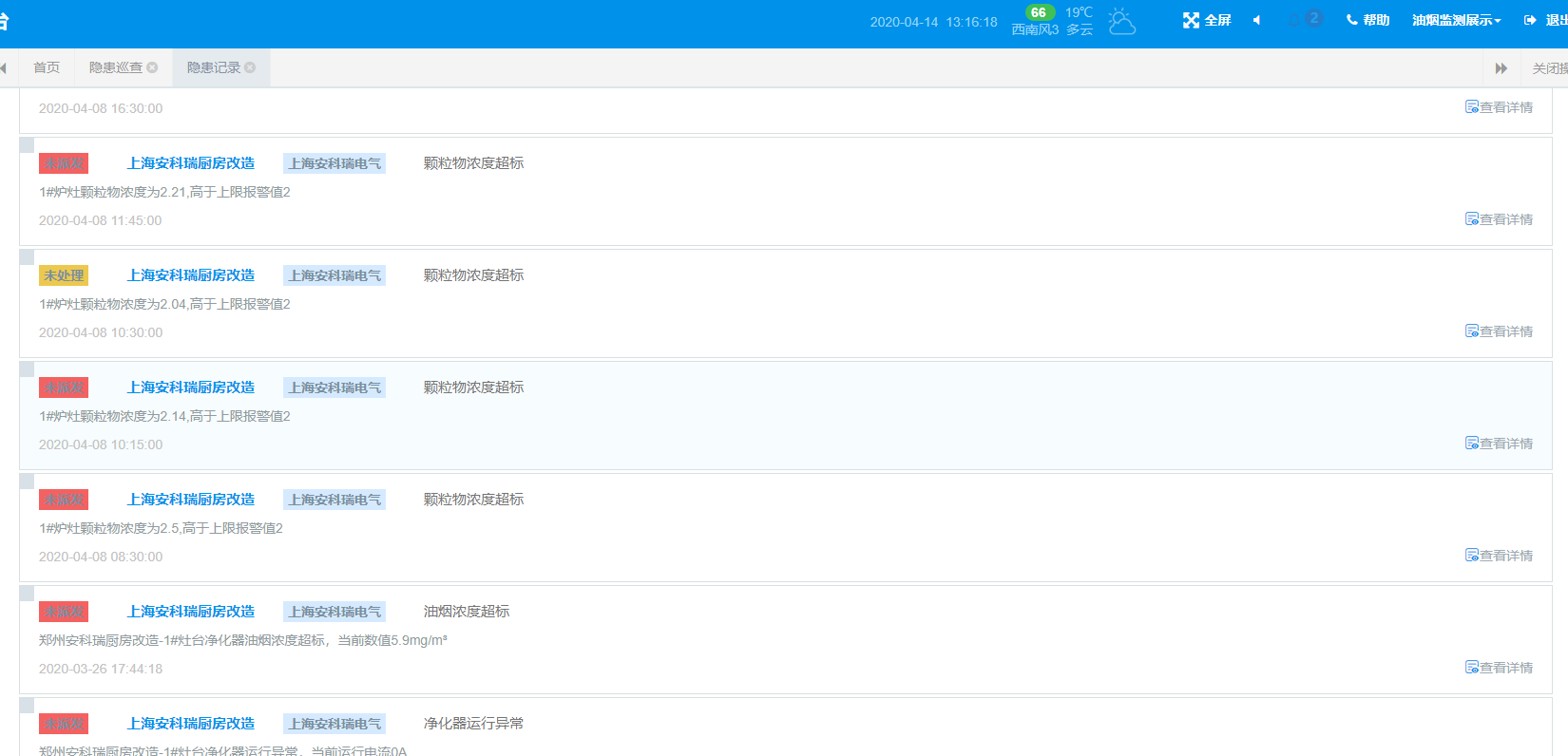 系統(tǒng)根據(jù)采集的油煙數(shù)值大小,產(chǎn)生對(duì)應(yīng)的排放超標(biāo)告警;對(duì)凈化器的運(yùn)行數(shù)據(jù)分析,上傳凈化設(shè)備對(duì)應(yīng)的運(yùn)行、停機(jī)、故障等告警事件。