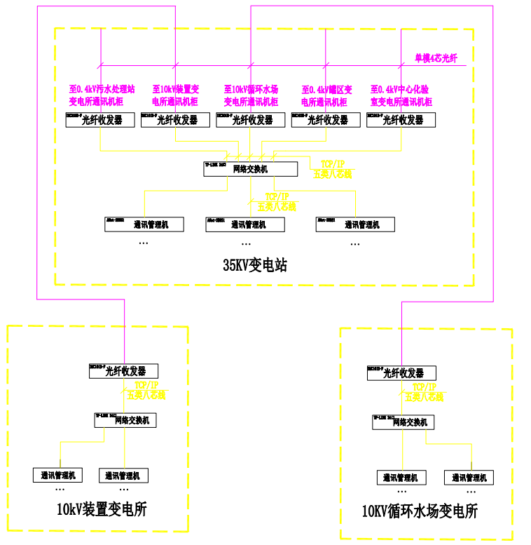本工程為山東凱瑞英材料科技有限公司羥脲磺胺類醫(yī)藥中間體產業(yè)鏈項目,本工程系統包含3個變電站(所)分別為35/10kV變電站、10kV裝置變電所和10kV循環(huán)水廠變電所。三個變電所均配置有后臺監(jiān)控系統,35/10kV變電站中放置三套后臺電腦,兩個10kV變電所各配置一套后臺系統。除10kV部分保護數據外,變電所下的0.4kV進線保護和母聯保護,馬達保護裝置數據均上傳接入10kV變電所后臺系統。最終兩個10kV變電所數據通過光纖上傳到35/10kV變電站后臺,進行集中監(jiān)控。35/10kV變電站集控系統同時預留了中心化驗室變電所,辦公樓變電所,污水處理站變電所,罐區(qū)變電所的數據接口。集控系統要求配備了智能設備接口,充分保證系統的安全可靠運行,也要求兼顧目前綜合自動化系統的全面性、先進性。